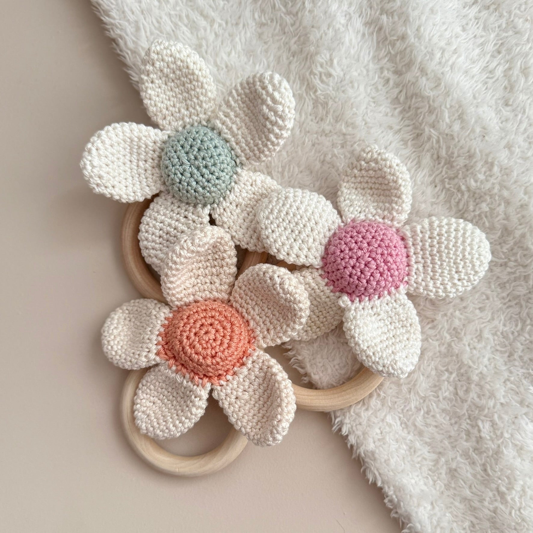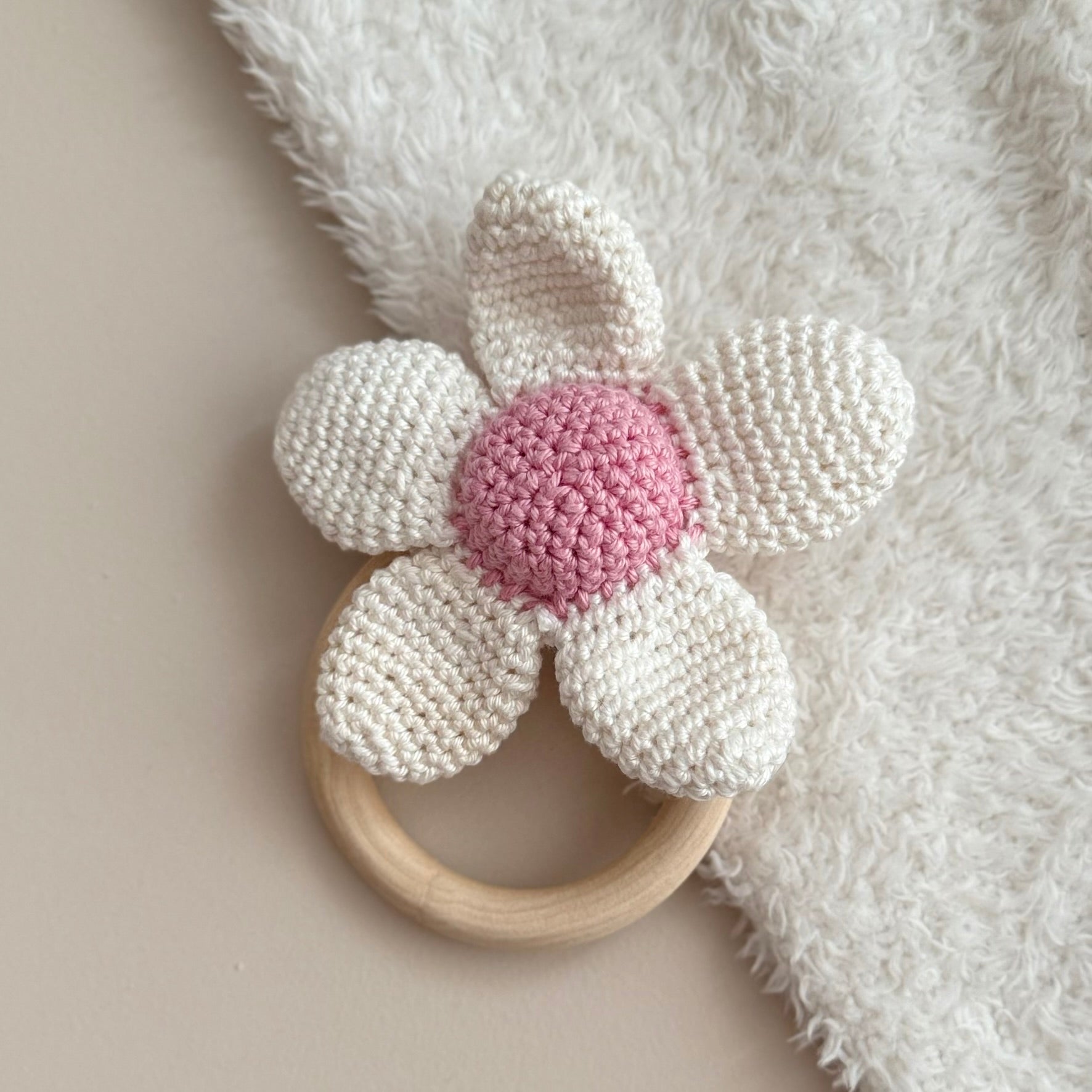 Deze lieve rammelaar is gehaakt, zit een rammelkraal in verwerkt wat goed is voor de zintuigen van je kindje. alles is 100% veilig.
