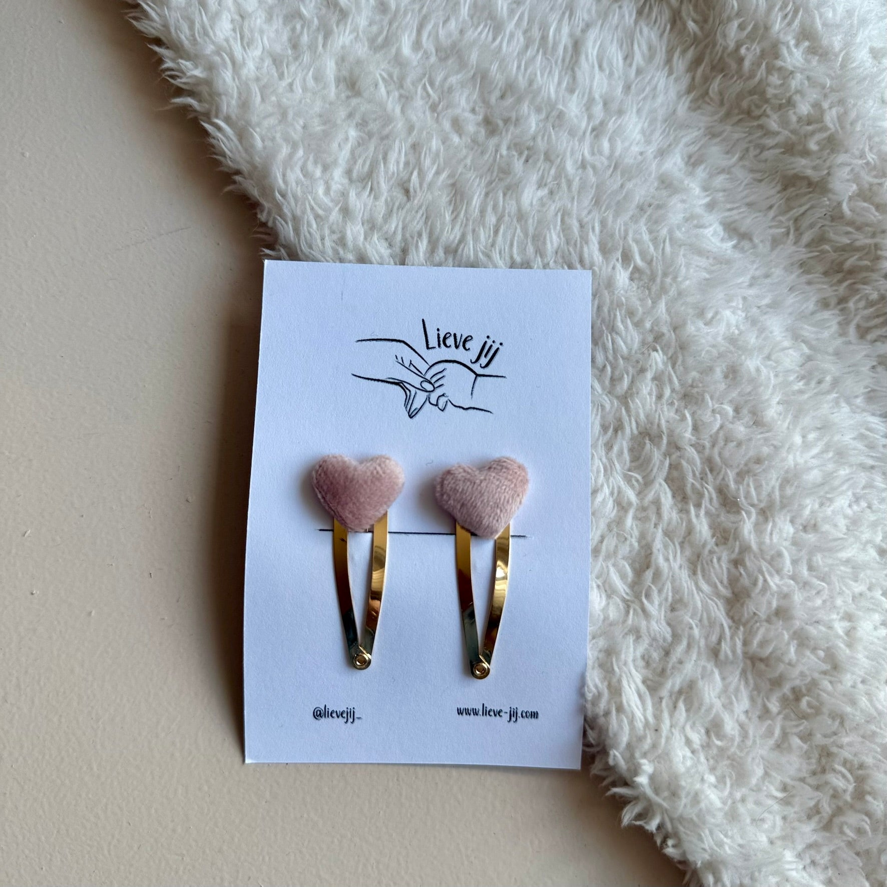 Lichtroze fluwelen hartjes op gouden klikklak clipjes