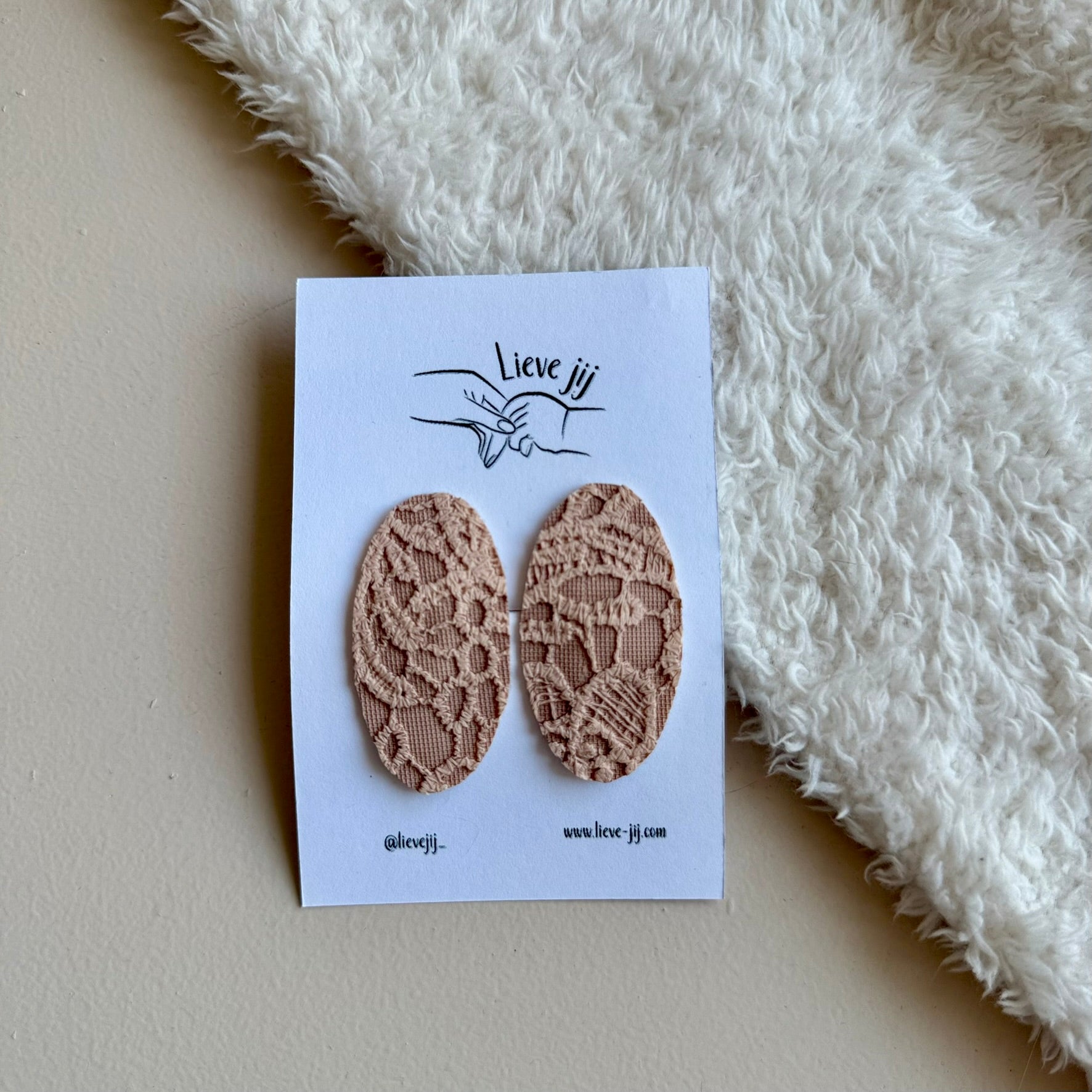Nep leren stof met kanten opdruk in roze op gouden klikklak clipjes.