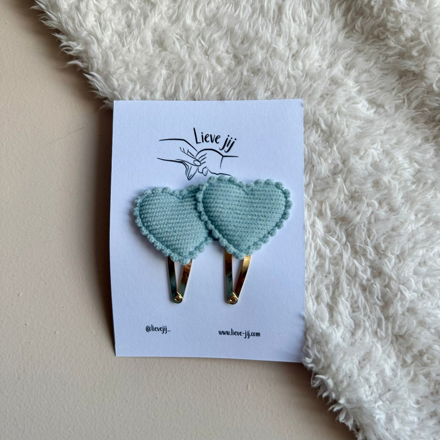 Blauw/groene hartjes rib op gouden klikklak clipjes.